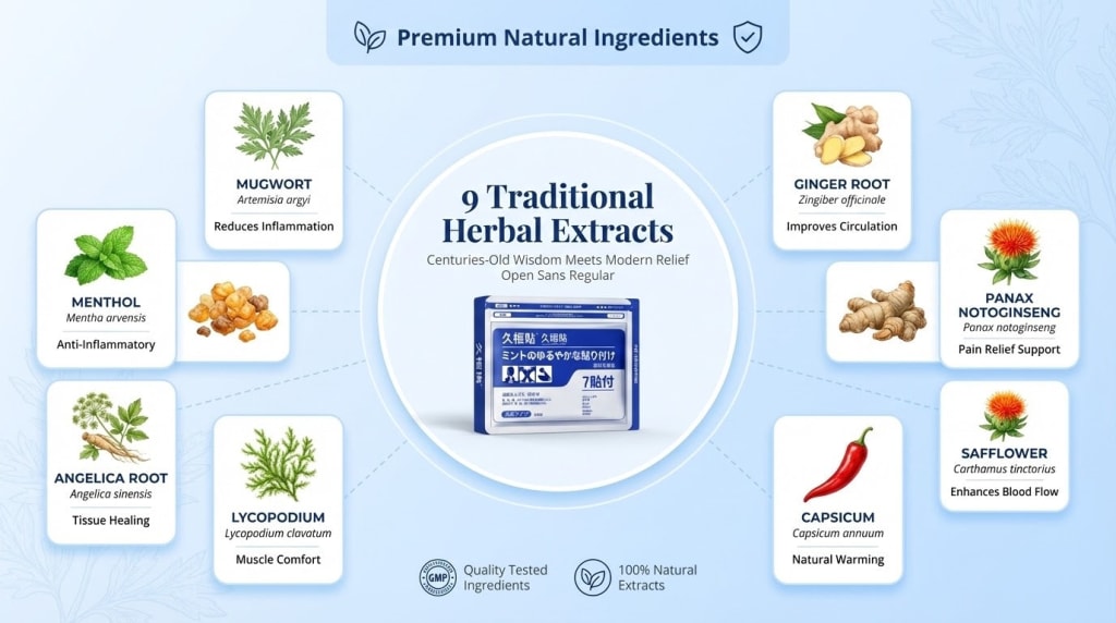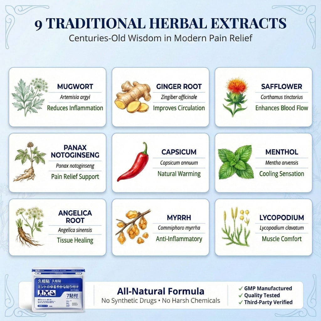 Embrace life without the constant nag of muscle and joint discomfort. Our Japanese Pain Patch, infused with nine traditional herbs and cooling menthol, offers long-lasting relief without any sticky residue or systemic side effects. Easy to apply and gentle on even the most sensitive skin, it empowers you to stay active and worry-free, whether at work, at home, or on your favorite weekend adventure.